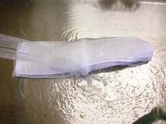 ヒレは、魚体に密着させて、折らないように注意して包みます。