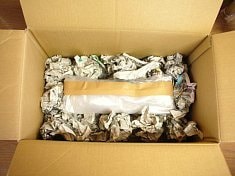 ダンボール箱に入れて、魚が動かないように新聞紙をまるめた緩衝材を隙間にいれます。