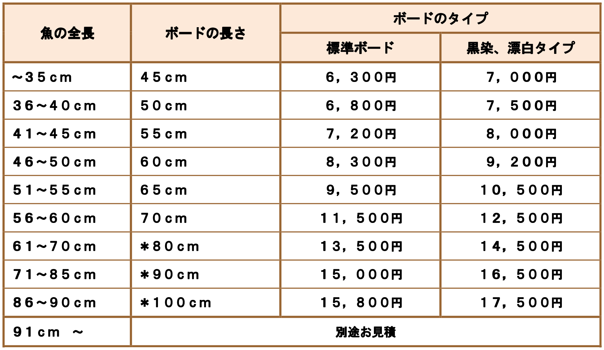 * 細長い魚(なまず、雷魚、など)、両面しか作成出来ない魚(ふぐ、ホウボウ、コチなど)は、5割増(価格表 一般魚× 1.5)